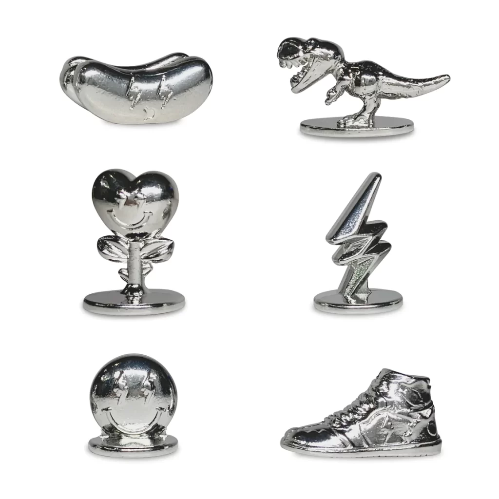 Contenido: Tablero de juego, 6 fichas personalizadas, 28 cartas de título de propiedad, 16 cartas de azar, 16 cartas de cofre comunitario, 1 paquete de dinero MONOPOLY, 32 casas, 12 hoteles, 2 dados e instrucciones.
