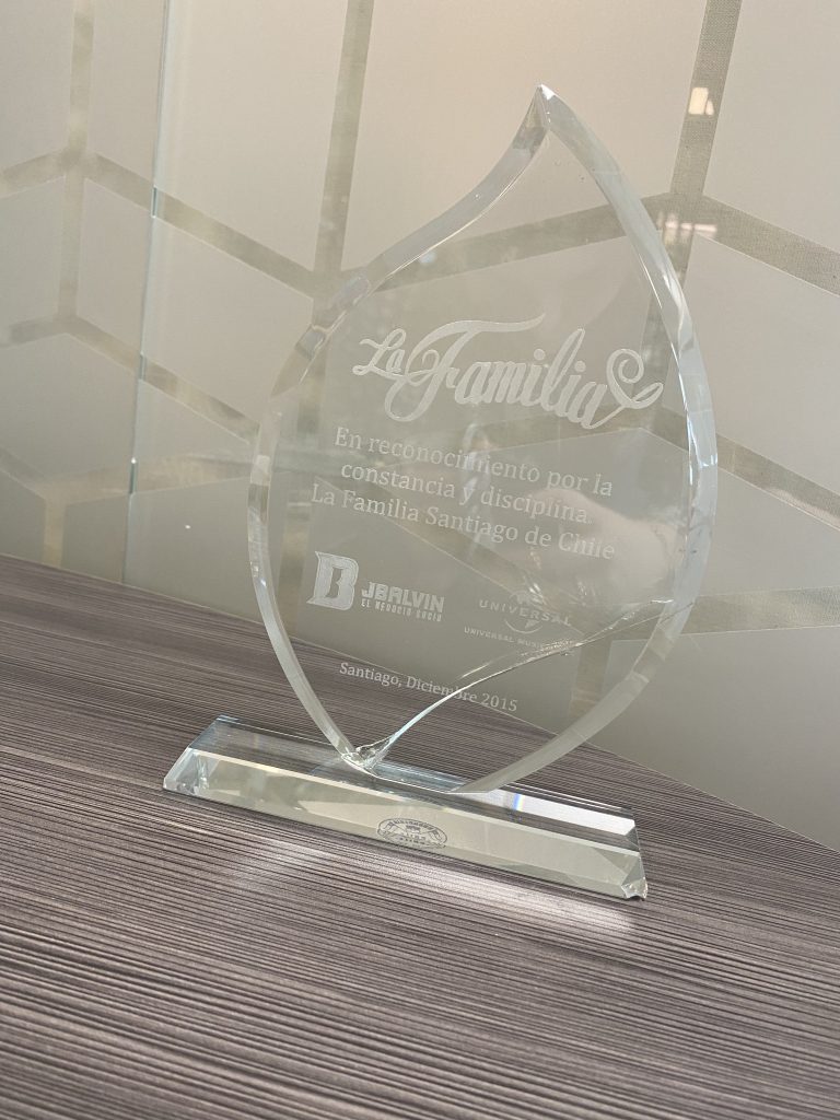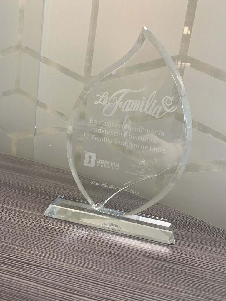 J Balvin recibe un reconocimiento de “La familia del negocio” en diciembre del 2015 en Santiago de Chile.